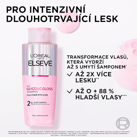 Elseve šampon na vlasy Glycolic Gloss s kyselinou glykolovou přináší vlasům až dvakrát více lesku a až o 88% hladší vlasy.